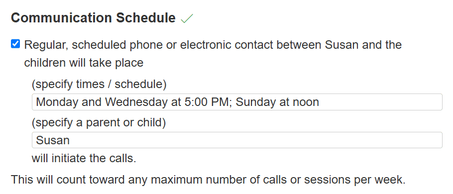 Specify the appropriate time for virtual visits, how often visits will happen and how long they'll last. This is better than putting in a vague provision allowing reasonable phone contact, like many lawyers do.