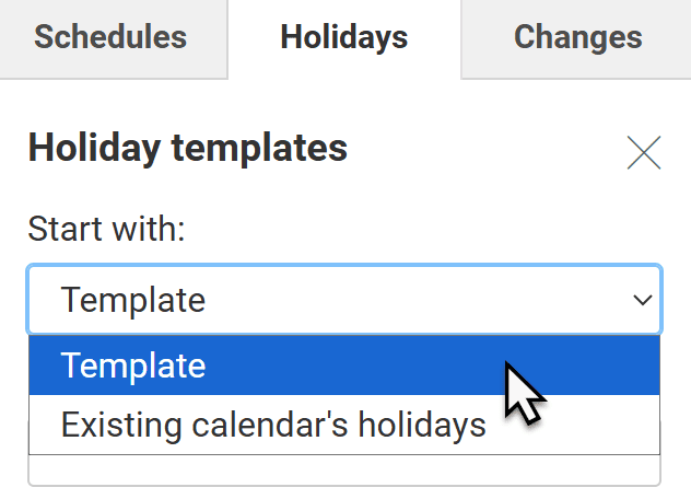 You can use templates to schedule a set of holidays instantly, or you can schedule holidays one by one.