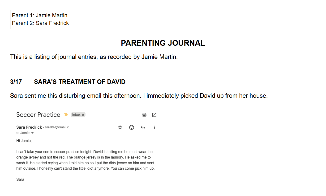 In your parenting journal, write down the details of abuse you witness. Information you hear from someone else — even from your child — probably won't be accepted as evidence, but you can note it as background information for yourself or your lawyer. Attach social media posts, photos or documents to support your journal entries.