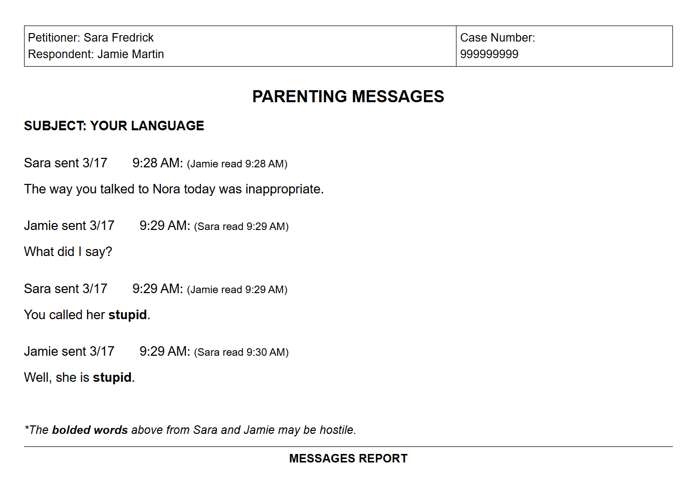 Message your co-parent on Custody X Change so you can organize conversations you may want to use in court. For example, you could label a conversation "emotional abuse" and "threats" without the other parent knowing. When you print or export messages, the hostility monitor makes it easy to see when a parent used harmful words about your child.