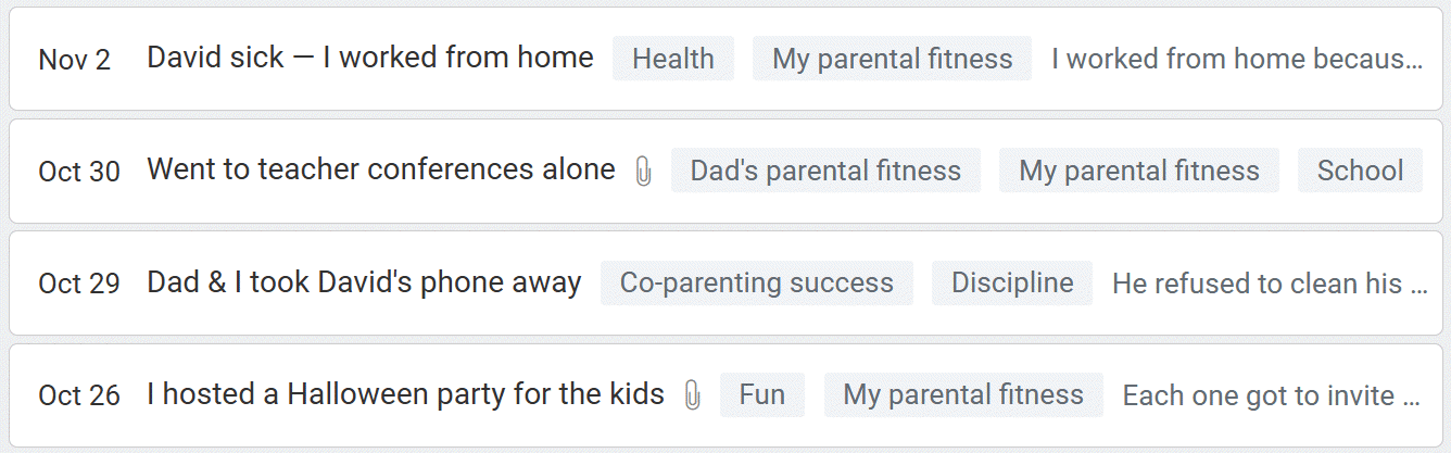 The Custody X Change journal helps prove your case through simple note-taking. You make quick entries about what happens in your child's life, and the journal formats it for court.