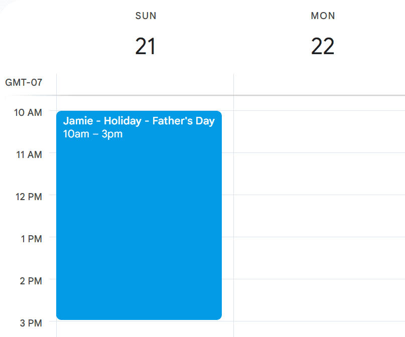 You can import one parent's time or both. Each event will be titled with the parent's name, the type of event (e.g., regular or holiday), then the name of the event. Here's an example of how it will look in your digital family calendar.